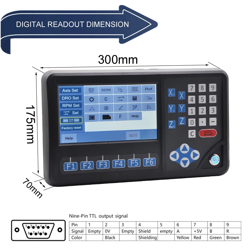 Product Feature 1. 7" super LCD screen, easy to recognize 2. Up to 5 axis input to work for high precision tool machining. 3. More than 10 drawings for different tools can be selected to make the machining much more convenient. 4. Special previewing the drawing function,after setting well the parameter ,the Dro will display the machined well effect which makes the operating be ,ore visual 5.Custom setting for the shortcut keys,operate can set the shortcut keys according to his operating habit |