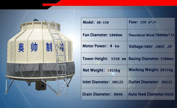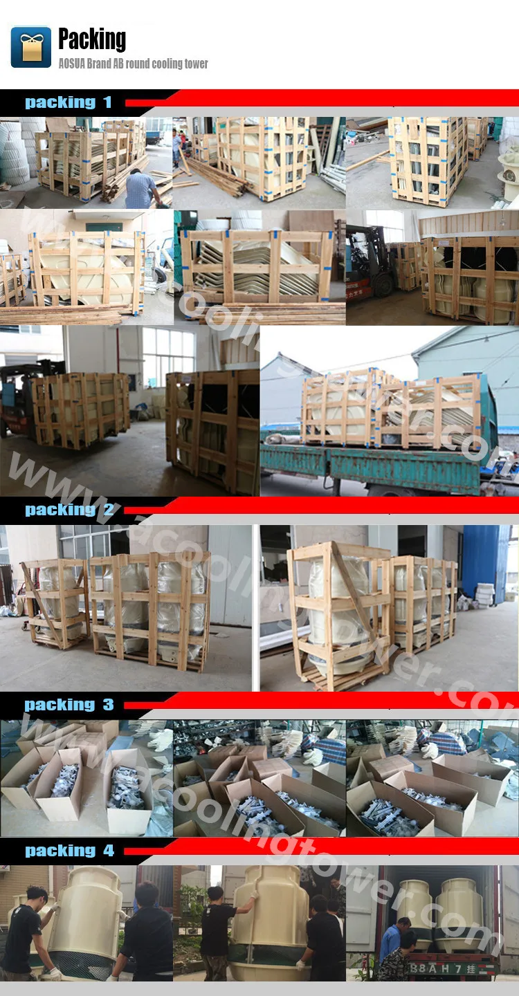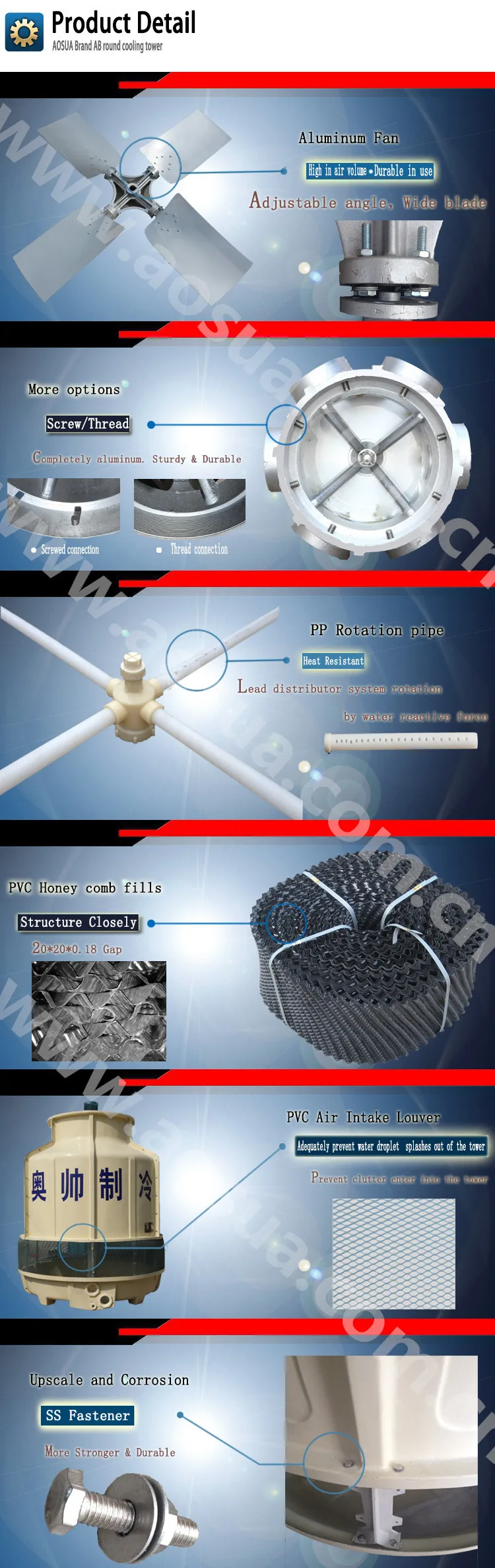 Aosua Round counter flow cooling tower has been technique corrected in the original basis.Not only match up high quality motor but also improve product’s material selection and technology.It make Aosua round counter flow cooling tower have more perfect users experience.