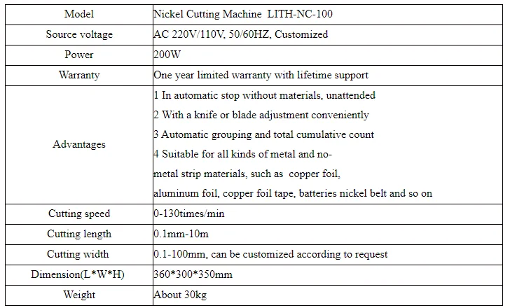 1. LITH-NC-100 Nickel Cutting Machine is mainly used for all kinds of metal and no-metal strip materials, such as copper foil, aluminum foil, copper foil tape, batteries nickel belt and so on.