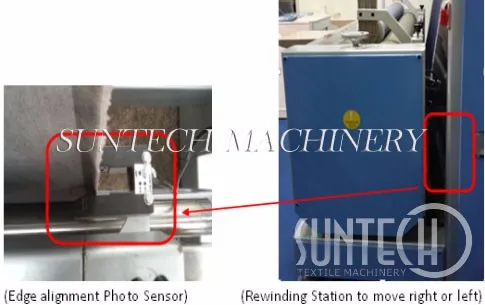 Edge Alignment Photo Sensor will align the fabric edge accurately. When fabric declines, the rewinding station will move left or right for aligning.