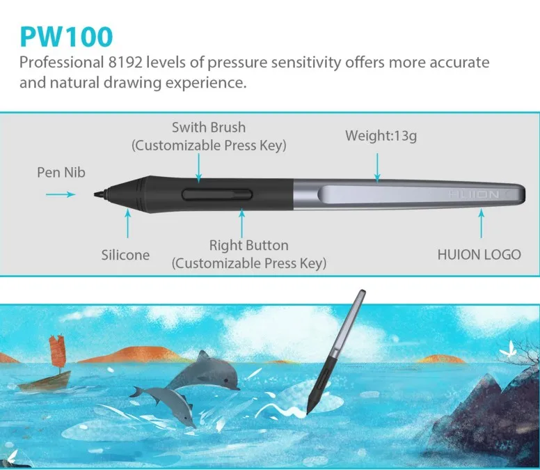 The pen PW100 is a stylish battery-free pen, thanks to EMR (Electro-Magnetic Resonance) technology, you no longer need to worry about the battery went out or dead.