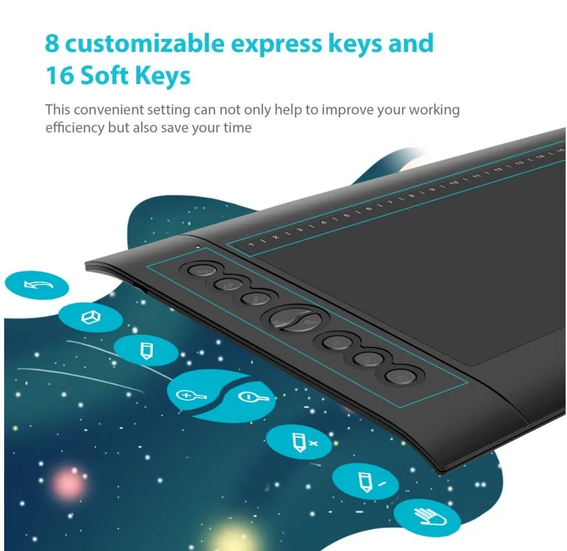 8 express keys on the left side of the tablet, and 16 soft keys on the top of the active area, plus two pen buttons, all customizable and easy to set up. You can tailor the setting to your preference.