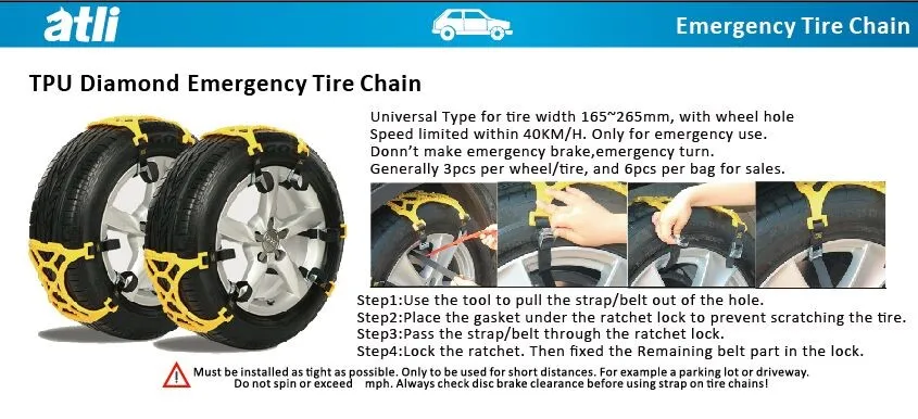| Product name: | TU dianmond Emergency snow Chain; | Maximum Speed: | 50km/h; |