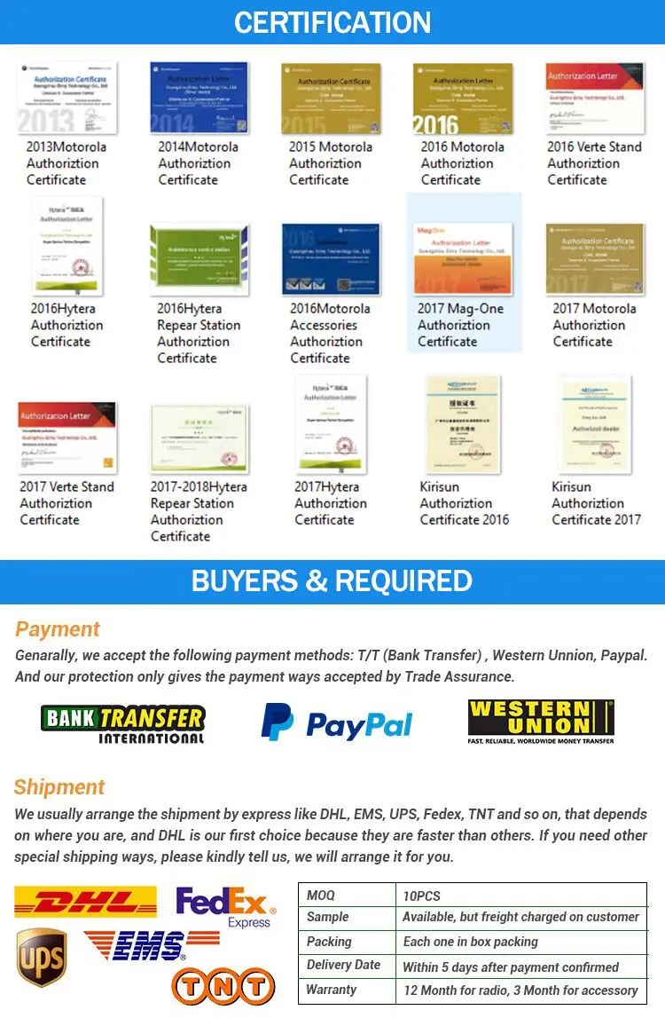 Yes, we are Motorola, Hytera, Baofeng, Vertex these radio authorized agent, all of these certificates we have and can offer to you