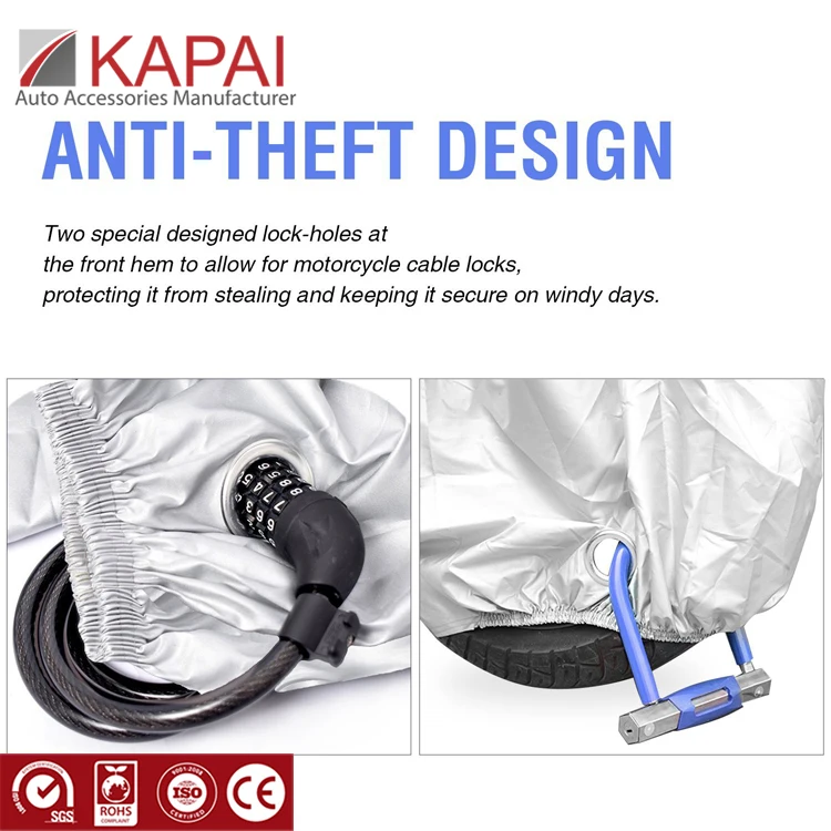 2. QUALITY MATERIALS-motorcycle cover is made of 180T/190T/210T polyester taffeta coated with PU materials, which is non abrasive and mildew resistant, water repellent, lightweight and super soft.