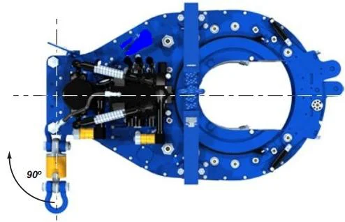 The use of a 5/8" or larger wire rope is recommended for the tong back-up line. It should be securely connected to the load cell at the rear of the tong and tied off to a suitable anchor. To assure accurate operation of the load cell and torque gauge, the back-up line should be connected at a 90 degree angle with the tong, and in the same horizontal plane. (square and level) (see illustration below):