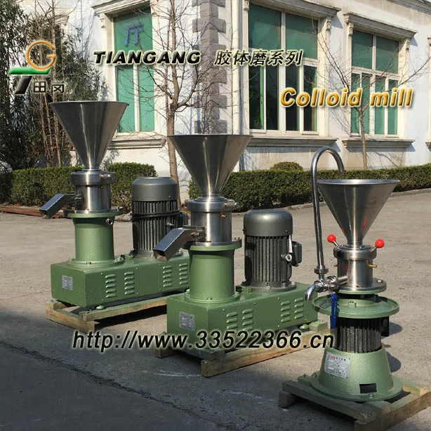 Application Scope:The colloidal mill is widely applied in sorts of products of many fields by its advantage such as foodstuffs industry, medicine industry, chemical industry and everyday chemical industry etc.; the products including soybean milk, fruit jam, peanut butter, artificial corn milk, cream, perfumery compound, pigment, greasing oil, dyestuff, pant, fish live oil, pollen, honey, tooth-paste and so on.
