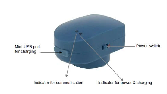 Charging: by connecting the mini-USB connector to Bluetooth optical probe, with other end of USB-A connector to the power adapter (DC5V /AC85~240V). Power adapter can be replaced by any of other USB source e.g. PC or NB.