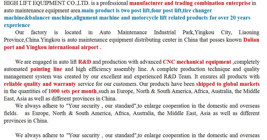 | Port: | DALIAN PORT; | Packaging Detail: | EXPORT STANDARD PACKAGE. Why choose us: Service: we supply total services for customers including marketing expansion,equipment installation and after-sales services. Warranty: we provide 1year machine and 18 months motor long warranty Price: As manufacturer in auto maintenance equipment.We always offer competitive distributor price,reliable quality and punctual delivery; |