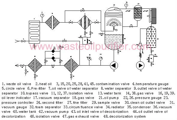 When the oil purification starts, firstly contaminated oil enter into heater, secondly flowed into pre-filter under the difference pressure, in which the large impurities are removed. Thirdly oil goes into intermediate filter. Fourthly oil flow into decolorization system to change the color, then go to water separator, the water separator adopts a special skill which changes the change the impaction of oil and water to speed up trace water and coagulate big water which is separated from oil and stored in water content. After that, oil passes through the fine filter and fine particles of matters is removed during the process. Finally oil flows into vacuum pump which use stereo-evaporation removing residual trace of water and steam is condensed in the condenser or expelled out by the vacuum system. the oil was transported out by oil pump. The purification process has finished.