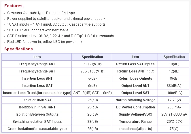 | Trunk Loss (Cascade) SAT: | 4 dB; | Input: | 16 satellite inputs;1 terrestrial input; |