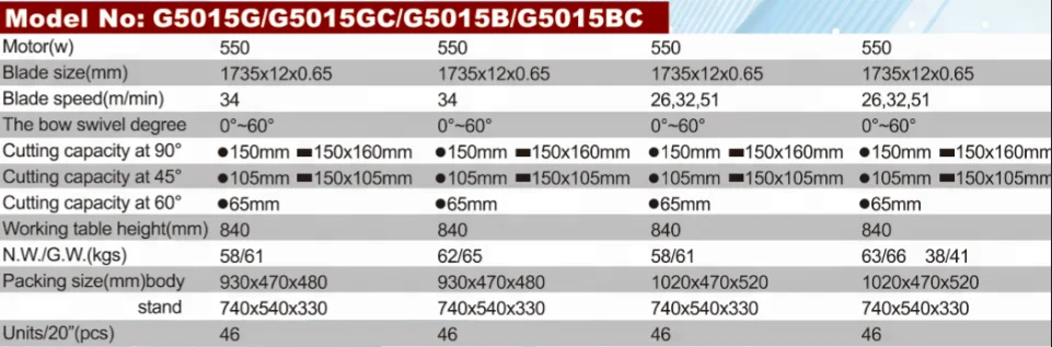 | Cutting capacity at 90°: | 150mm; | Packingsize: | 930*470*480mm /1020*470*520mm; |