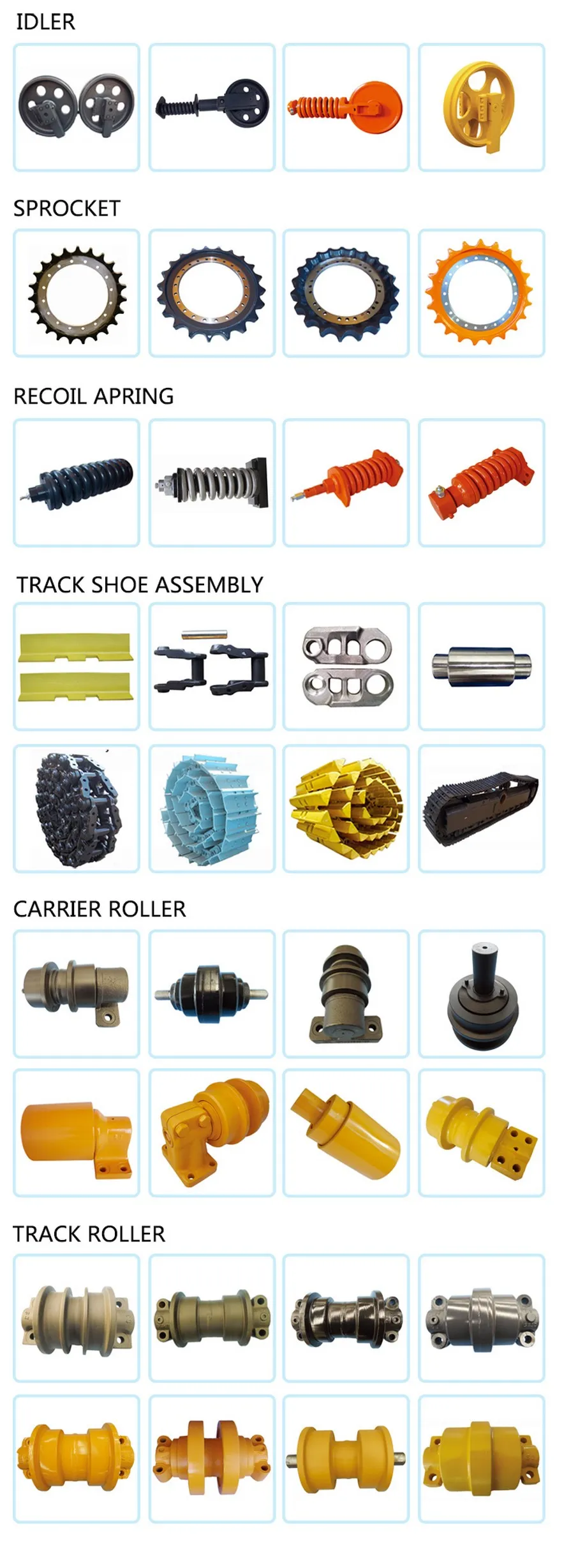 We can supply all kinds of undercarriage part for excavator, bulldozer type.Take the undercarriage parts for example, we have the track idler, sprocket, track roller/ bottom roller, carrier roller/ top roller, track shoe, track chain / link, track adjuster, recoil spring, yoke, cylinder, etc, if you can't find what you are looking for in the list, please feel free to contact us.