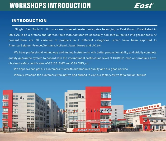 Ningbo East Tools Co; ltd is an exclusively-invested enterprise belonging to East Group.Established in 2004.As to be a professional garden tools manufacturer, we especially dedicate into garden tools. At present, our garden tools have exported to America, Belgium, France, Germany, Holland, Japan, Korea and UK, etc.