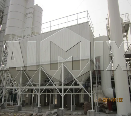 China 50t/h dry mix plaster mortar production line,the pretreatment raw materials will be lifted into raw material silo, then raw material is flowing through the hopper, Next, by computer ingredients, screw conveyor metering, mixing and packaging machine package to bags or in bulk or finished goods warehouse into the car storage process into the final product.