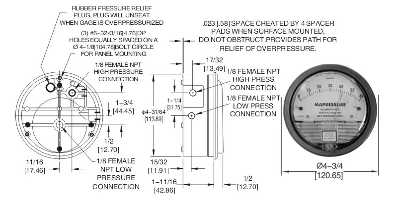 Connections | 1/8"female NTP high and low pressure taps, duplicated, one pair side and one pair back. |