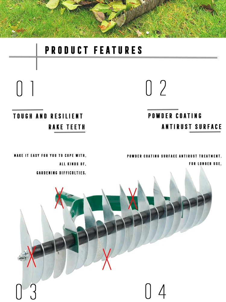 | Payment Terms: | L/C,D/A,D/P,T/T,Western Union,MoneyGram,paypal; | Name: | hand tools moss removal tool garden rake thatching double rake; |
