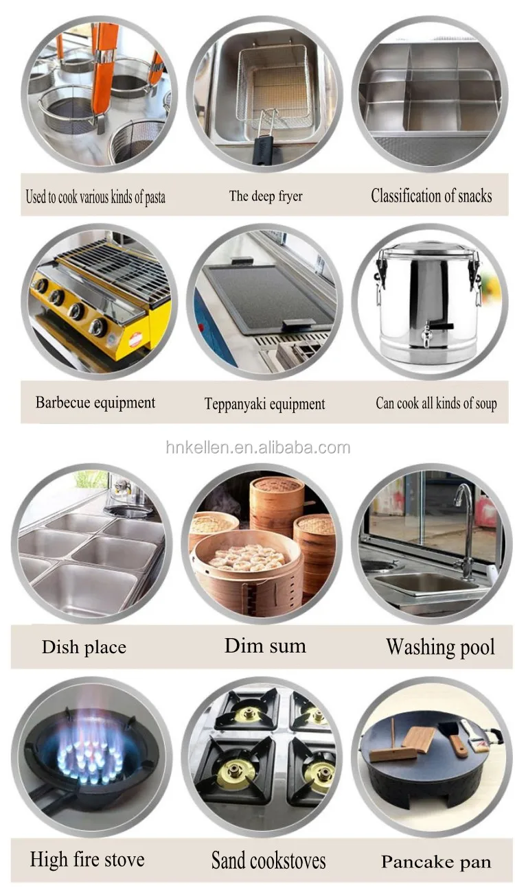 8.All kinds of cooking equipment can be installed inside the kitchen parts, such as fryer, steamer, BBQ grill, hot dog machine, water sink, fridge, ice cream machine etc.