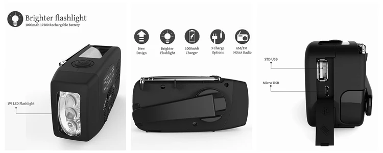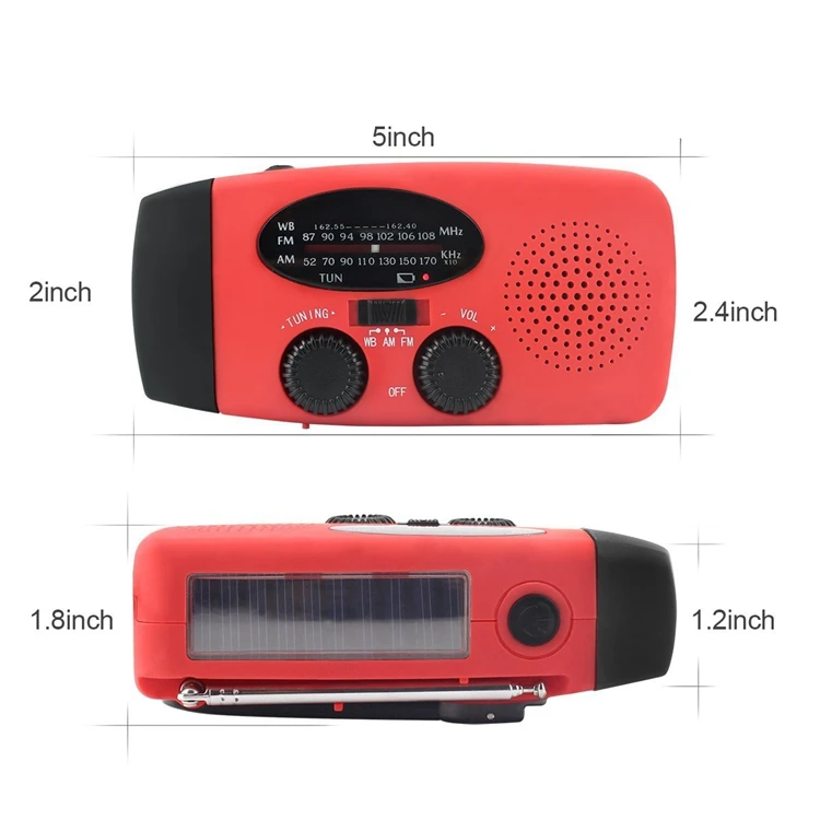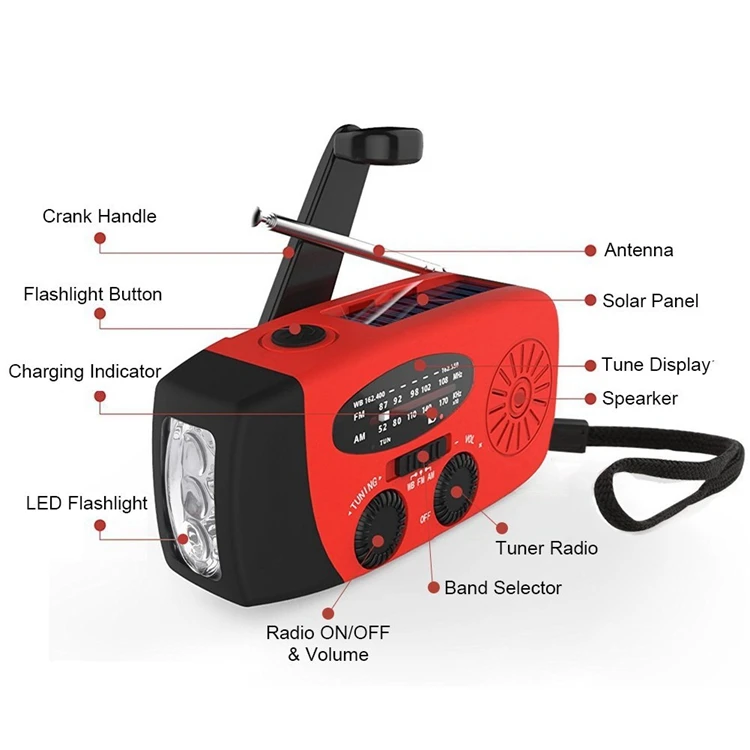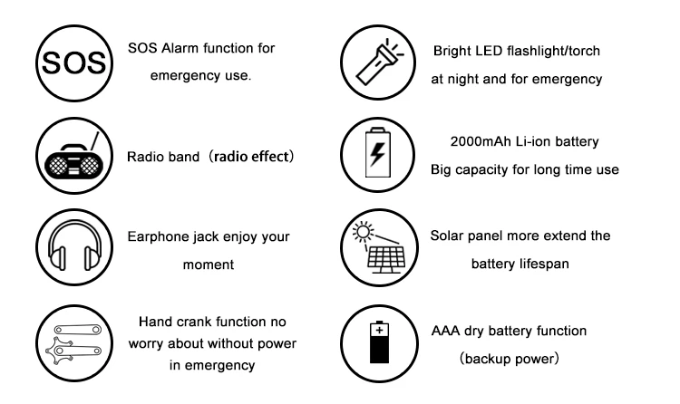 | Functions | AM/FM/NOAA Radio; 1 W LED torch; 2000 mAh power bank |