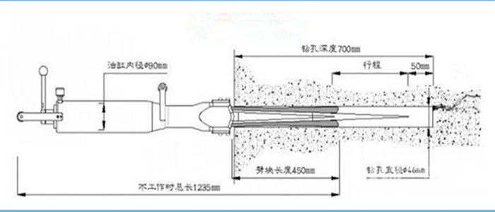 | Model | drilling depth(MM) | drilling diameter(MM) | Wedge length(MM) | Theory division force(t) | Splitting time(s) | Single Weight(kg) | Dimension |