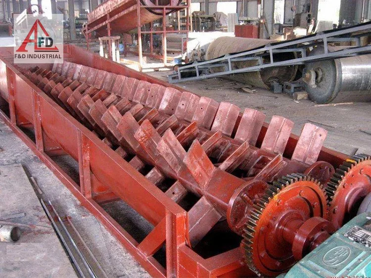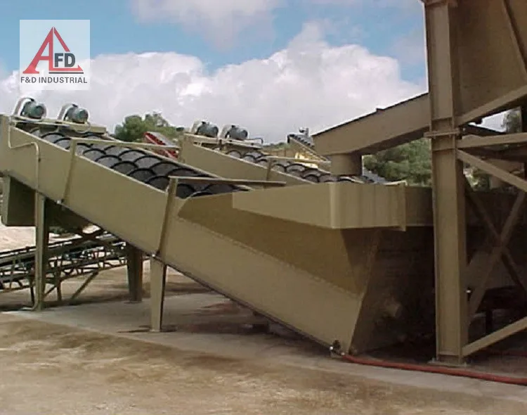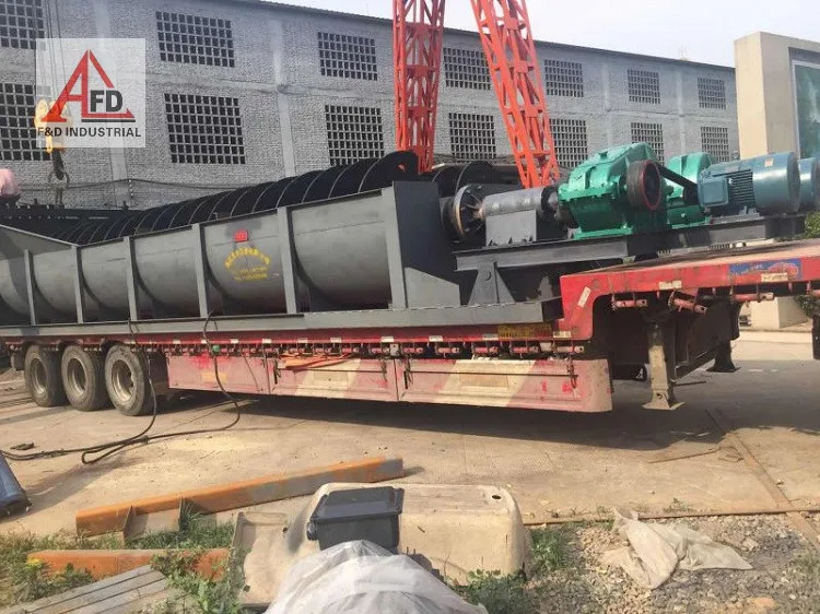The sand washer is developed according to the principle of different particles with different fall velocities because of their sizes and densities. Fine particles float in the water and form the overflow; coarse particles fall down to the bottom of the trough and are pushed to the top port by the impellers and discharge. During working, the motor drives the impellers to rotate slowly by triangle belt, decelerating motor and gears. Sand enters the washing trough from the fed trough, roll and grind each other under the driving of impellers. Then wrapped impurity around the sand surface is removed and the vapor layer is destroyed at the same time. While the impurities and dirt is removed by the added water flow, cleaned material is conveyed upward by the rotating impellers to the discharge chute.