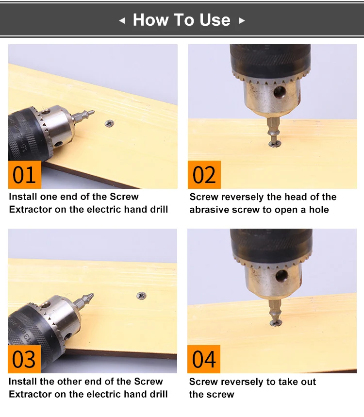 | Model Number: | 4pcs Damaged Screw Extractor Set; | Hardness: | HRC 63; |