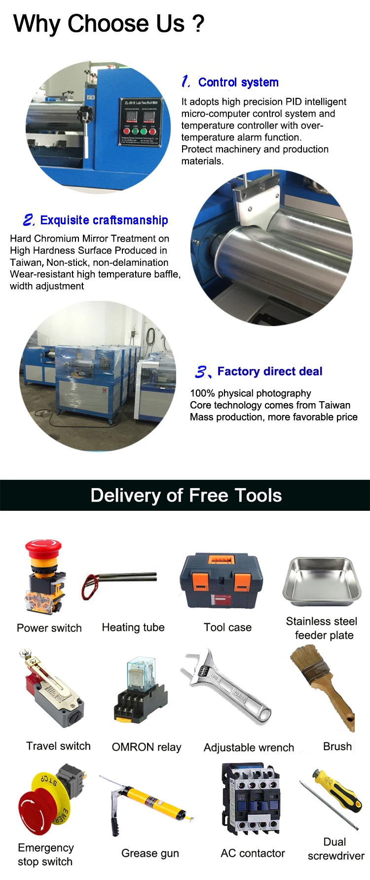 It is widely used in rubbers and plastics industry for polymer mixing, such as PVC, color master batch. It consists of roll, bearing, gap adjusting device, electric control system, safety device, etc.