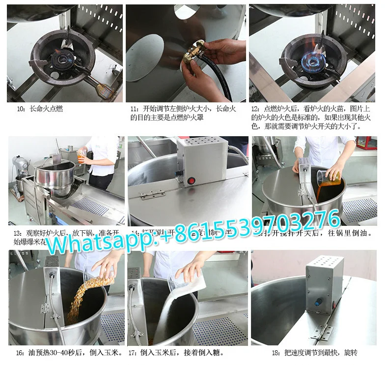 Every production: Use 500 grams of sugar, 500 grams of oil, 500 grams of corn, according to 1: 1: 1 ratio, the first into the oil in the pan, stirring a little slow, and so the oil temperature to a certain temperature, first put a few grains corn try to see whether corn kernels burst open, if burst open, the rest of the corn into them, and put into the sugar, then close the lid, put a little faster transfer speed stirring, stirring for a while, open the lid to look at If all burst open, then turn off the power and gas.