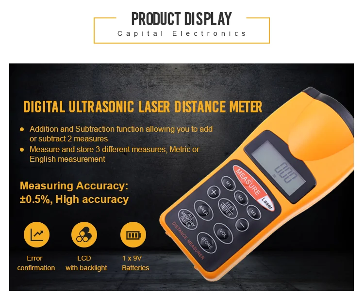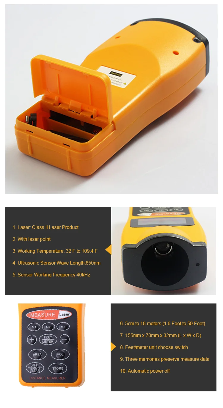 Feature | 1.6 to 59 feet measuring range, Feet/meter unit choose switch, Three memories preserve measure data, Memory clear function, Automatic power off, Error confirmation, Sensor Working Frequency 40kHz |