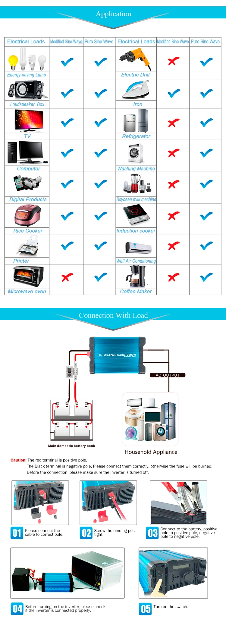 If your load is resistive loads, such as: bulbs, you can choose a modified wave inverter. But if it is inductive loads and capacitive loads, we recommend using pure sine wave inverter. For example: fans, precision instruments, air conditioner, fridge, coffee machine, computer, and so on. Modified wave can be started with some inductive loads, but effect for load using life, because capacitive loads and inductive loads need highquality power.