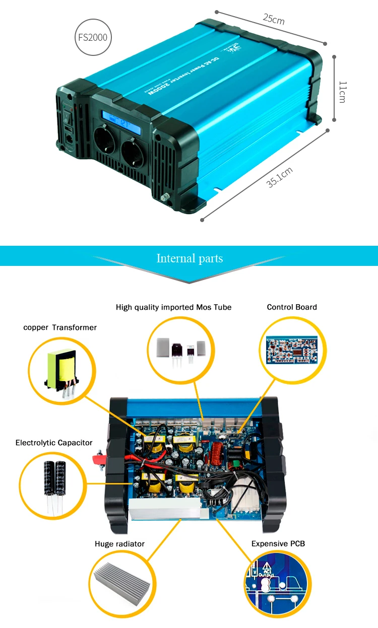 A:In china market, There are many factories selling low-cost inverters, which is actually some assembled small unlicensed workshops, it crudely, to reduce costs and use of substandard components for assembly, and some factories sells less power. For example real power is 600w but write 1000W or more. there is a very big security risk! In order to protect the personal and property safety, please do not covet low price, be sure to choose a reliable inverter!