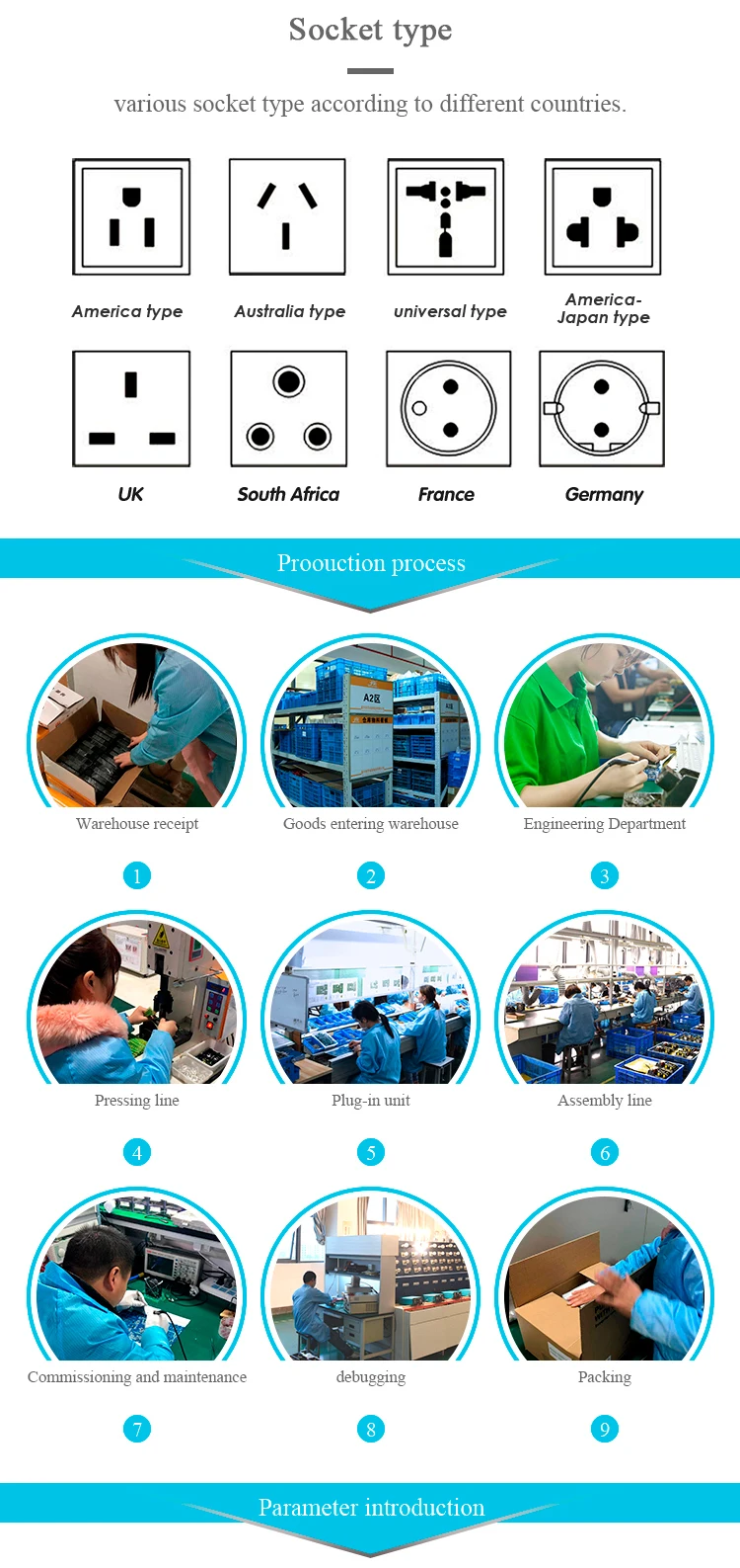 | Standard Receptacles | USA/British/Franch/Schuko/UK/Australia/Universal etc.optional | ||||||