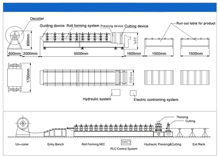 Material supporting frame→Molding core→Hydraulic system→Automatic control system→Automatic shearing maechanism→Roll forming receiving tables