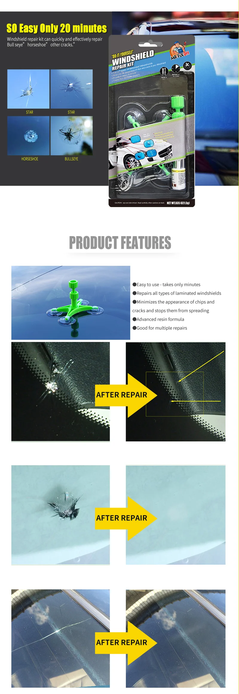 | Product name: | Windshield repair kit; | Package size per batch: | 58X23X37 cm; |