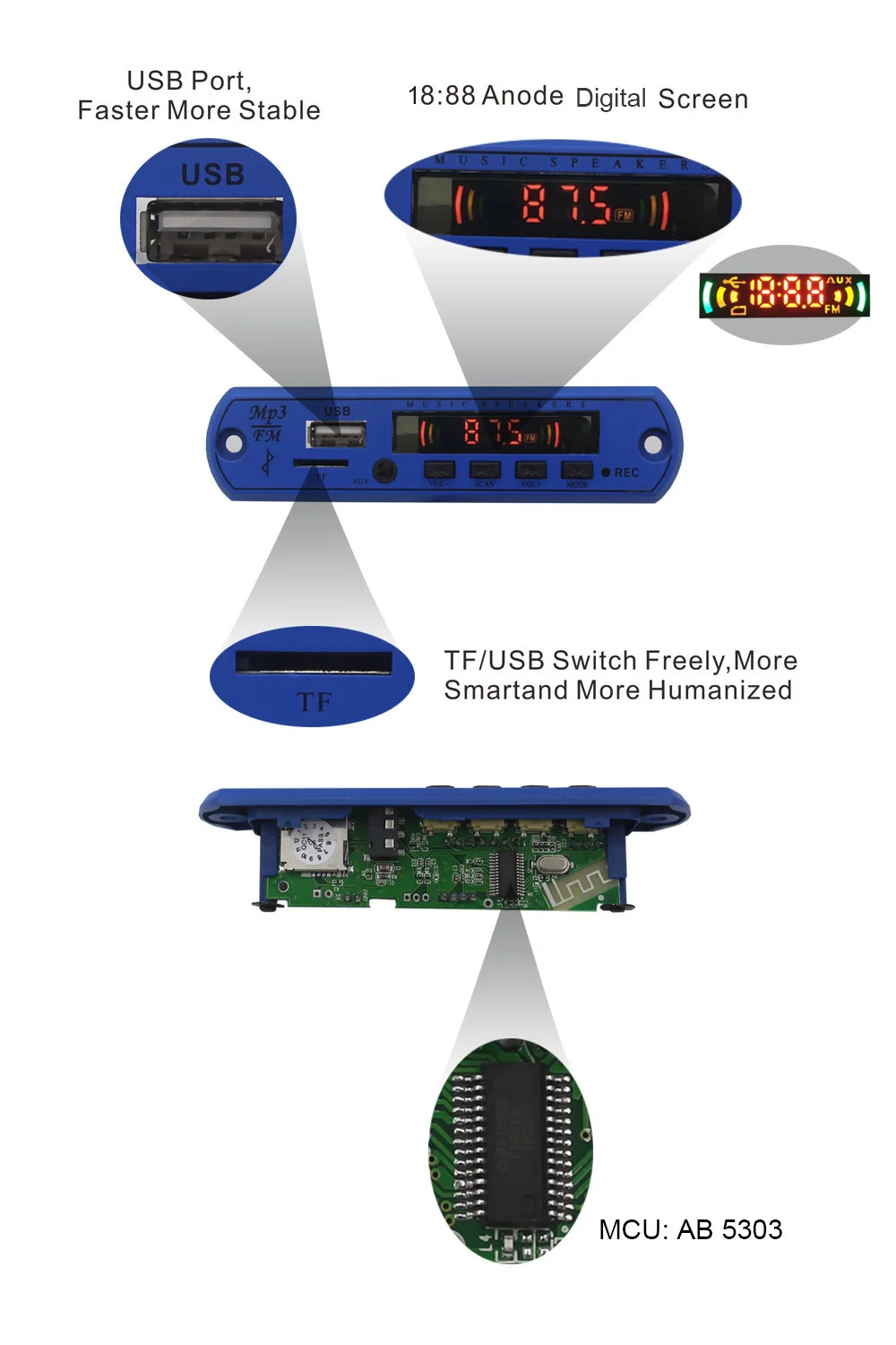 | MCU IC Chip: | AC6902/JL6902; | Audio Format Support: | MP3, WMA, WAV, MP1, MP2; |