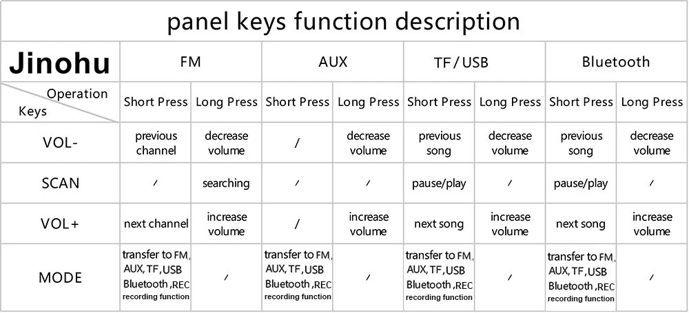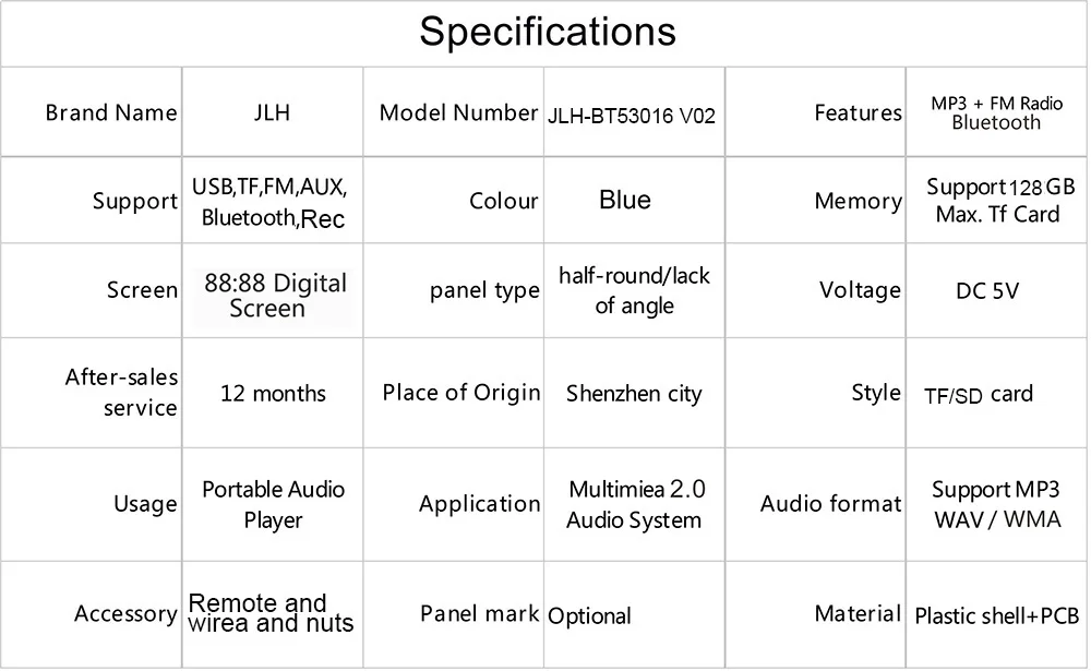 | Main Function | Bluetooth FM USB TF AUX Remote |