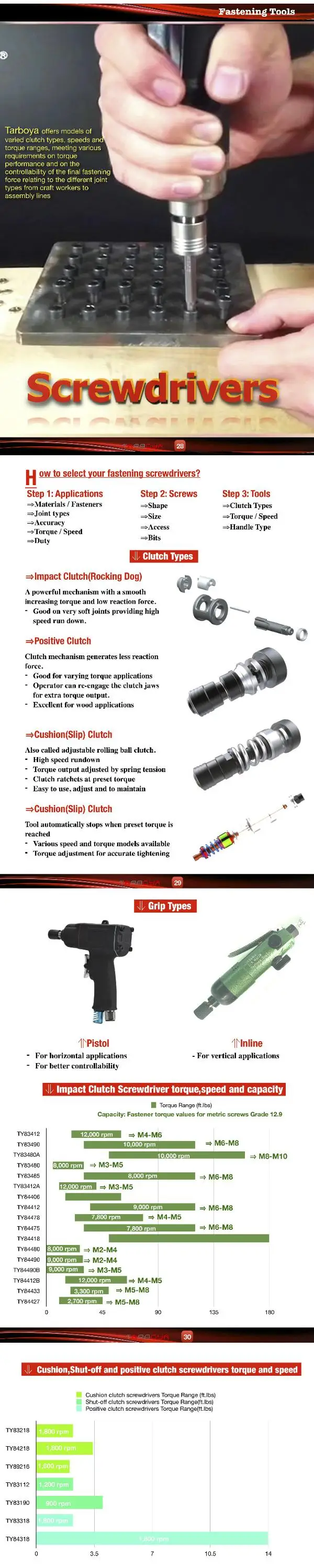 TY83480 is a reversible air impact screwdriver provides plenty of torque in hard-to-reach places. It has three speed settings in addition to reverse and features a spring-loaded quick-release chuck for added convenience. The ergonomic paddle switch reduces hand fatigue for extended use.