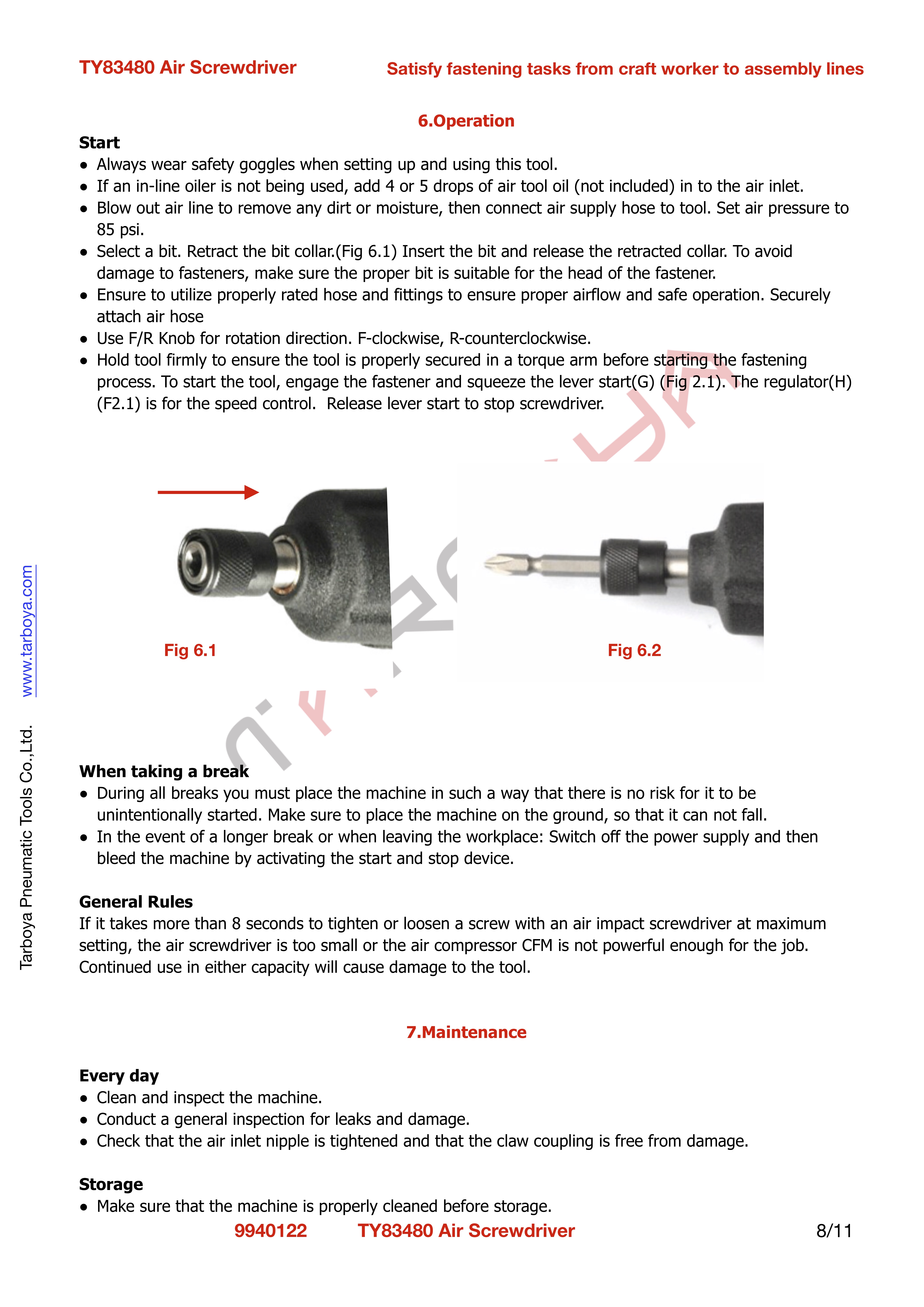 Tarboya warrants TY83480 Pneumatic 1/4" reversable impact screwdriver will not have any material or manufacturing defects for the period of 6 months from the date of delivery. The warranty for flawless function of the goods and the materials used is granted for the period of 6 months from the date of delivery of the goods.