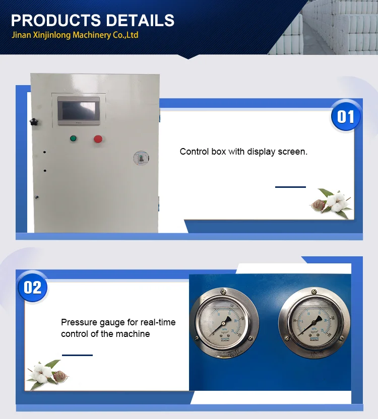 It is used for cotton processing, textile, printing, livestock, paper making and industrial soft fiber. It is used for baling Lint cotton, waste cotton, flax, wool, fiber, straw, paper, wood pulp and leftover waste. It makes the store and transportation of industrial soft fiber easier.