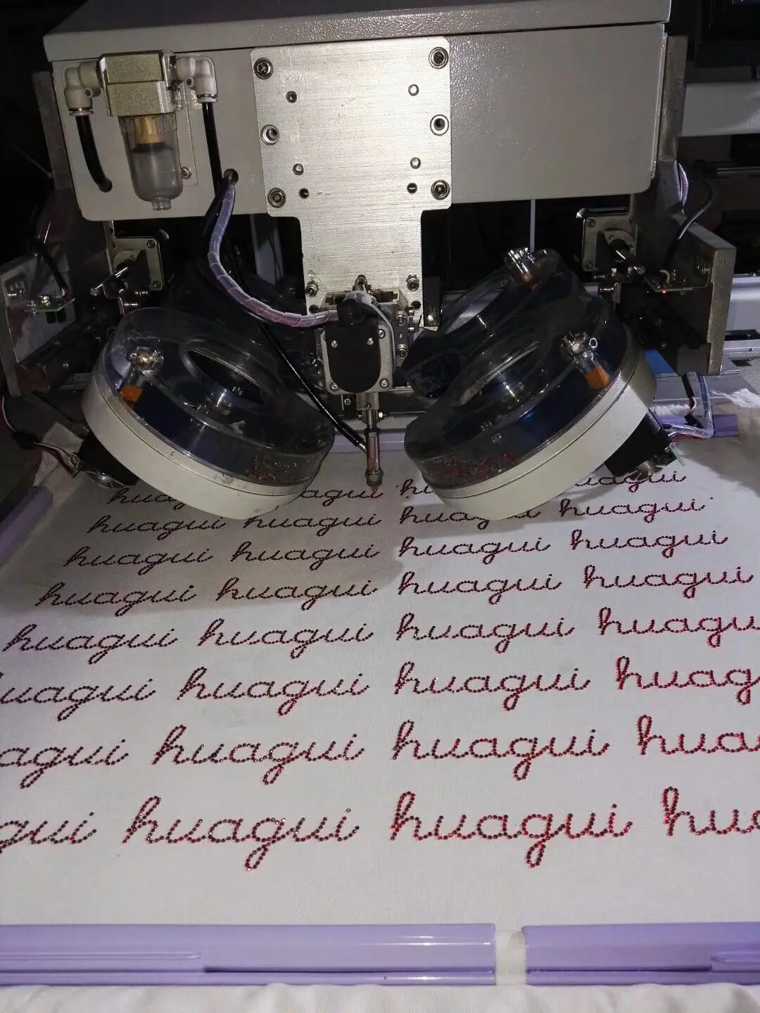 This rhinestone setting machine through ultrasonic heating principle, picking up rhinestones by Pneumatic control method. At the same time move the material accordingly by hand after the red light locate, then the machine will fix rhinestones on the material quickly.Working speed can reach 280-350pcs rhinestones per minute, and will not fall off after being cleaned by water.
