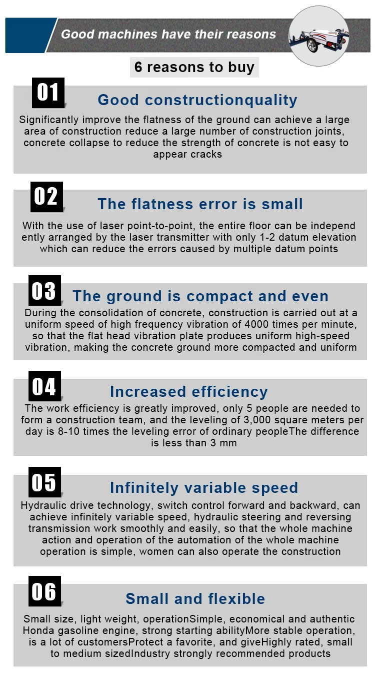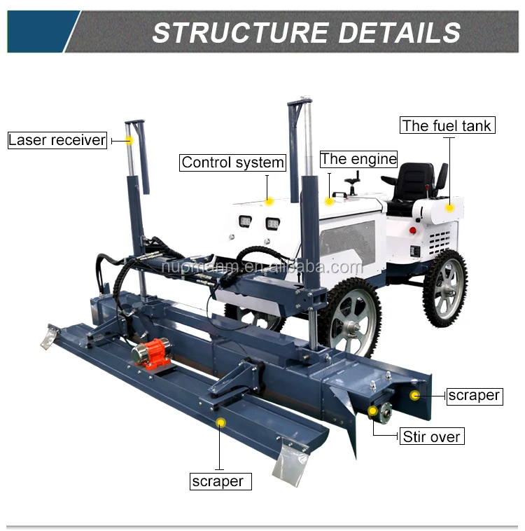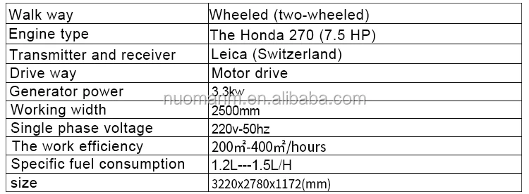 2. Use hydraulic drive system, with laser systems and computer control system to make automatic level and at the same time to finish leveling work.