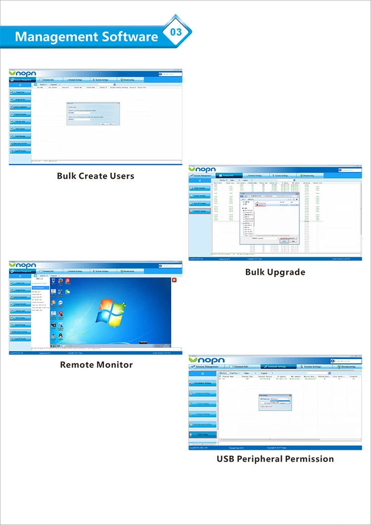 Fast create users,monitor,send message,one-key upgrade all terminals etc.