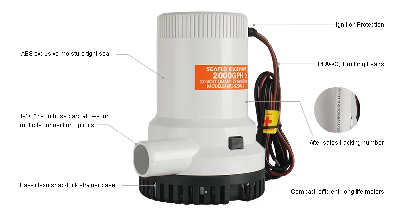 | SFBP1-G2000-01 | 1576 GPH | 12 V | 14.0 A | 14.0 A | 11.8' (3.6 m) | 3' (1 m) | 1-1/8" | 1.13/1.21 kg |