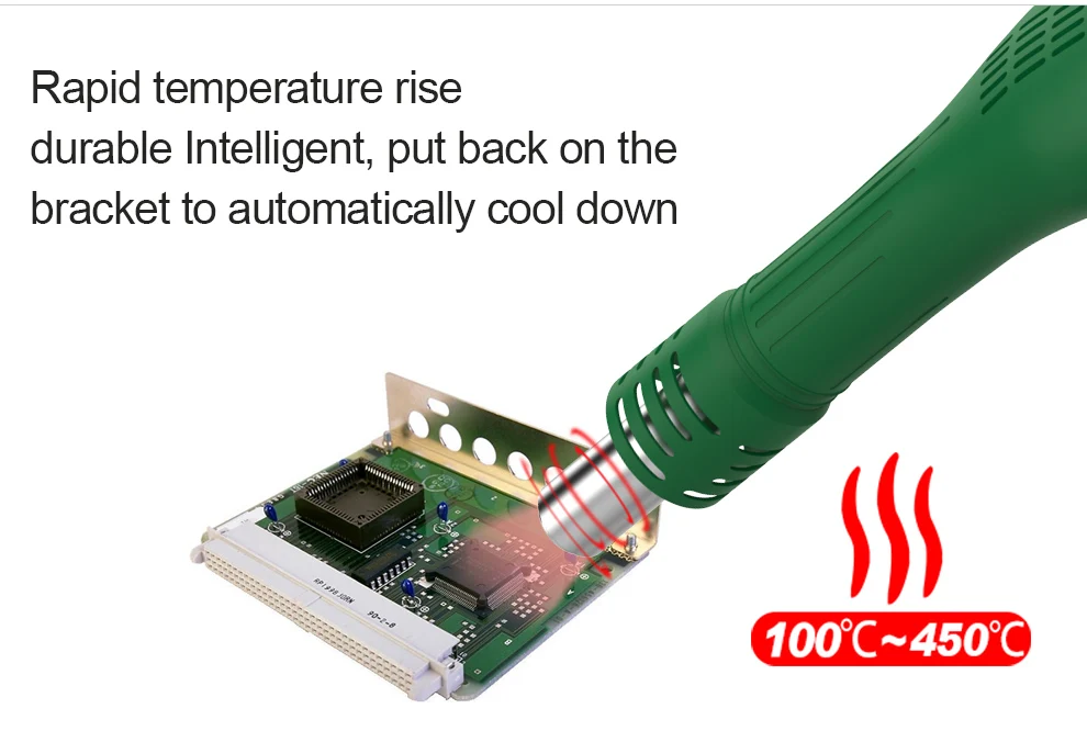 | 5 | Intelligent cooling system. When temperature is down to 100°C,it turn into energy saving state which can prolong the service life of the heating element and protect the hot air gun. |