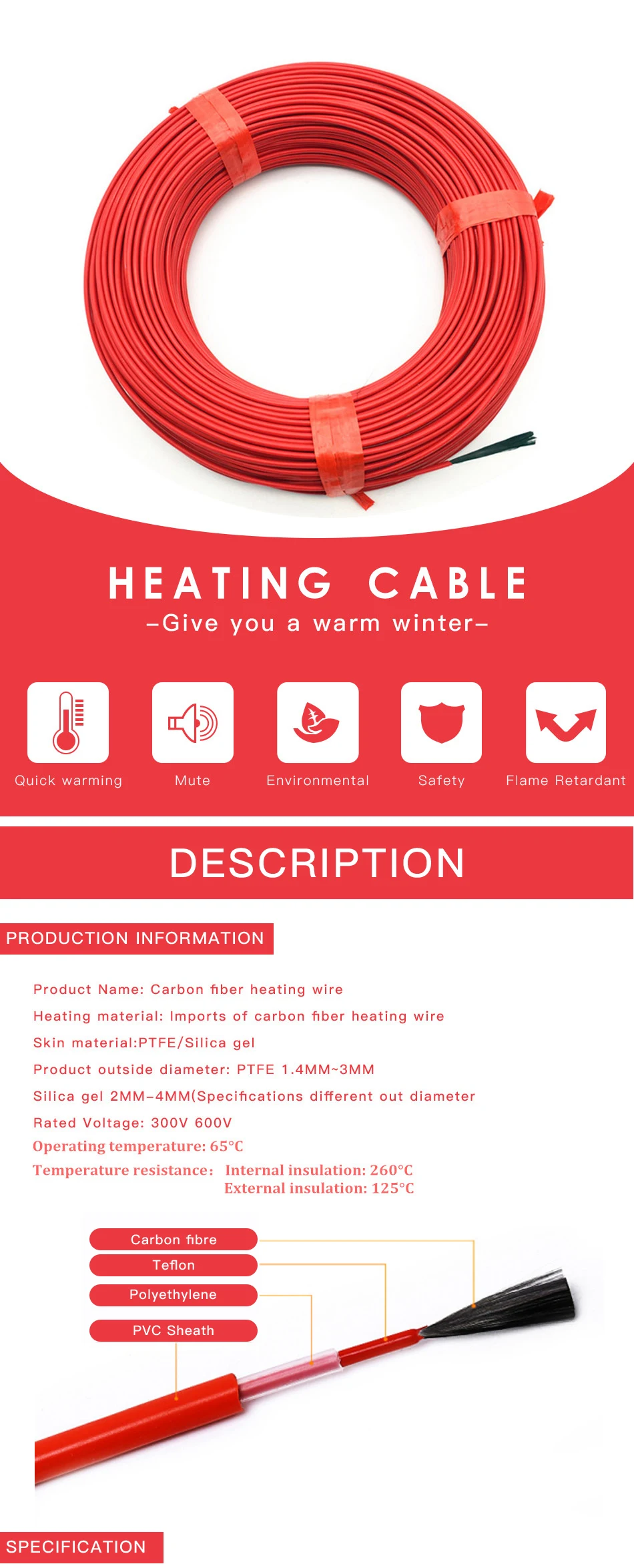 | Product name: | 24K Electric floor heating carbon fiber heating wire heating cable; | Jacket: | PFA, PTEF, PVC,FEP; |