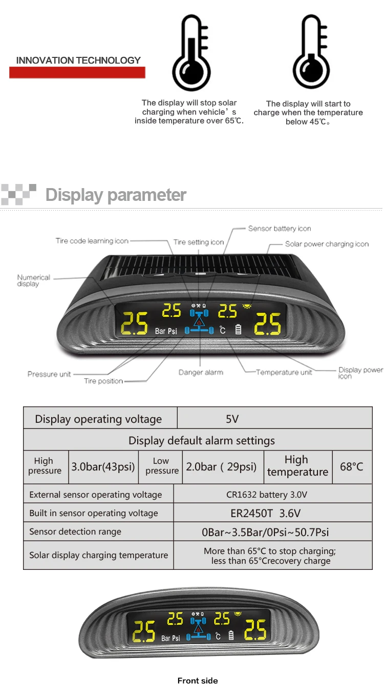2.Colorful LCD display, simultaneously show 4 tires'pressure and temperature