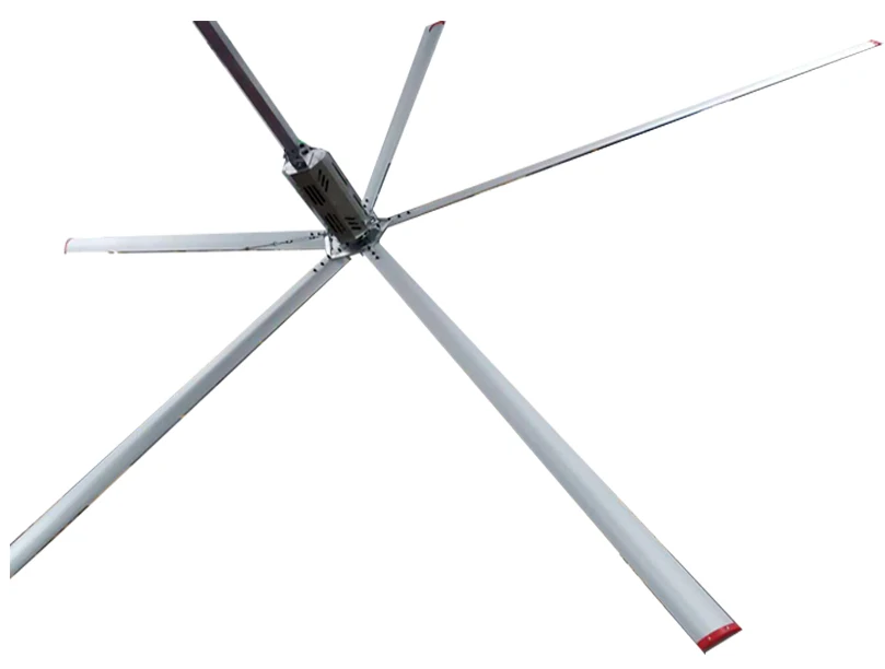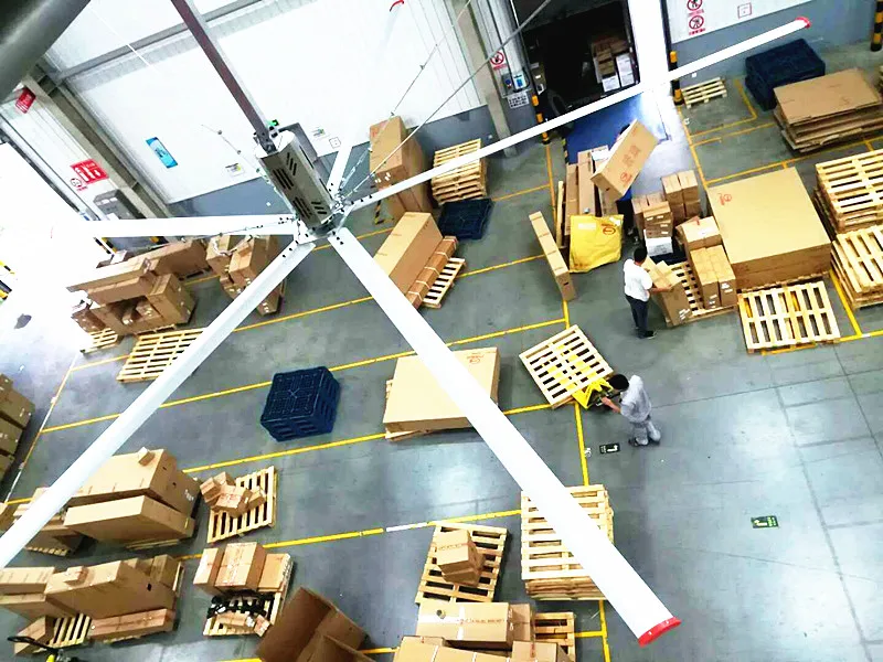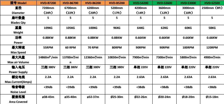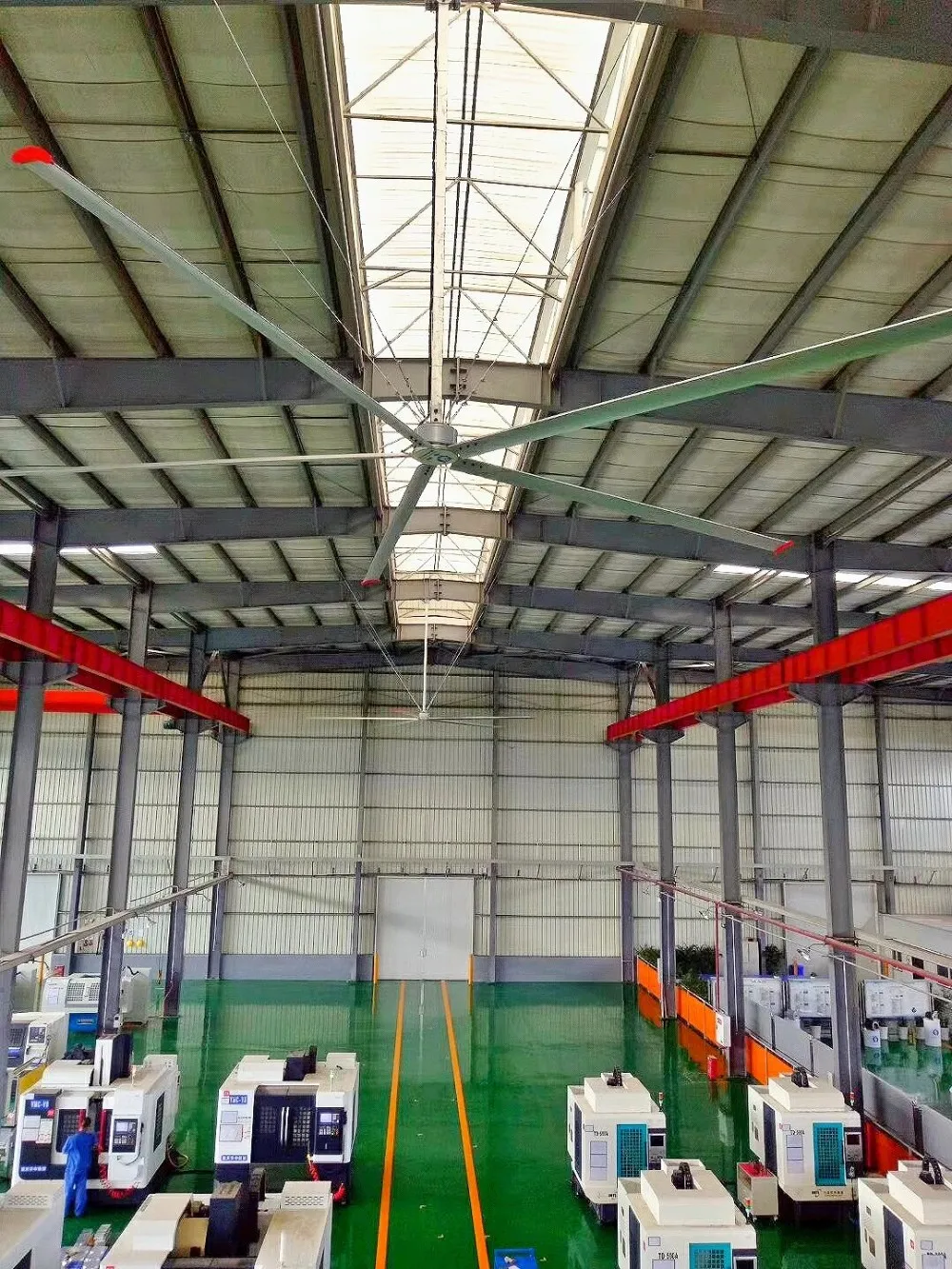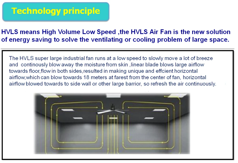 The fan is typically of 5(in odd number) pcs of large diameter blades up to 7.2 m each with the effective coverage of 1500 SQM. It consumes only 1.5 KW electricity per hour, which can replace hundreds large diameter Industrial Ceiling Fan with 5 blades pedestal fans or wall-mounted fans.