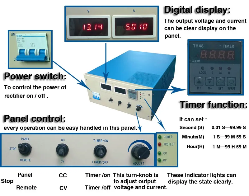 Voltage and current display, start/stop,indicator light of protect and power , adjustment of output value, CC/CV,timer. |