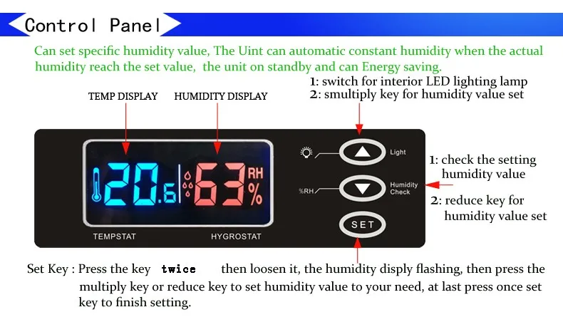 2.LED Digital display humidity 25~60%RH;