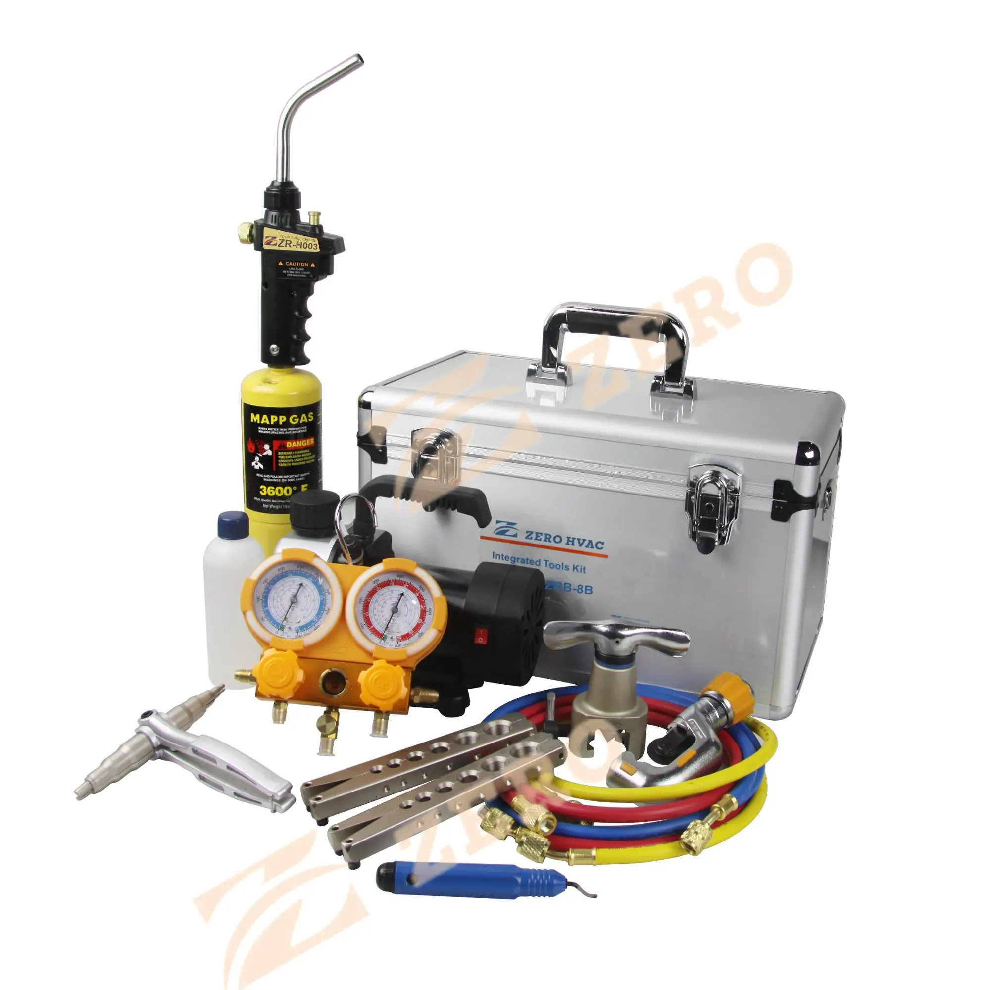 Including:Vacuum pump,Manifold gauge,Flaring tool,Tube expander,Tube cutter ,Hand torch,Aluminum packaging.